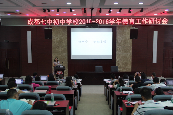 成都七中初中学校于2015年8月24日和25日,在学生工作部雷国亮和孙余主任的主持下,召开了为期两天的德育工作会议,主题为:“尊重学生个性,唤醒学生潜能”,学校全体行政、班主任及相关老师参加了此会议。