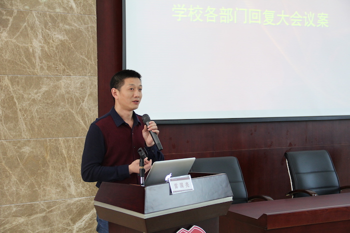 会议首先由教学管理部、行政后勤部、学生工作部的主任王岚老师、徐夕明老师、雷国亮老师对第一次会议的相关提案给予了高度评价并进行认真回复。