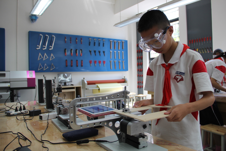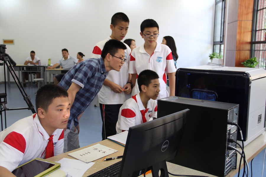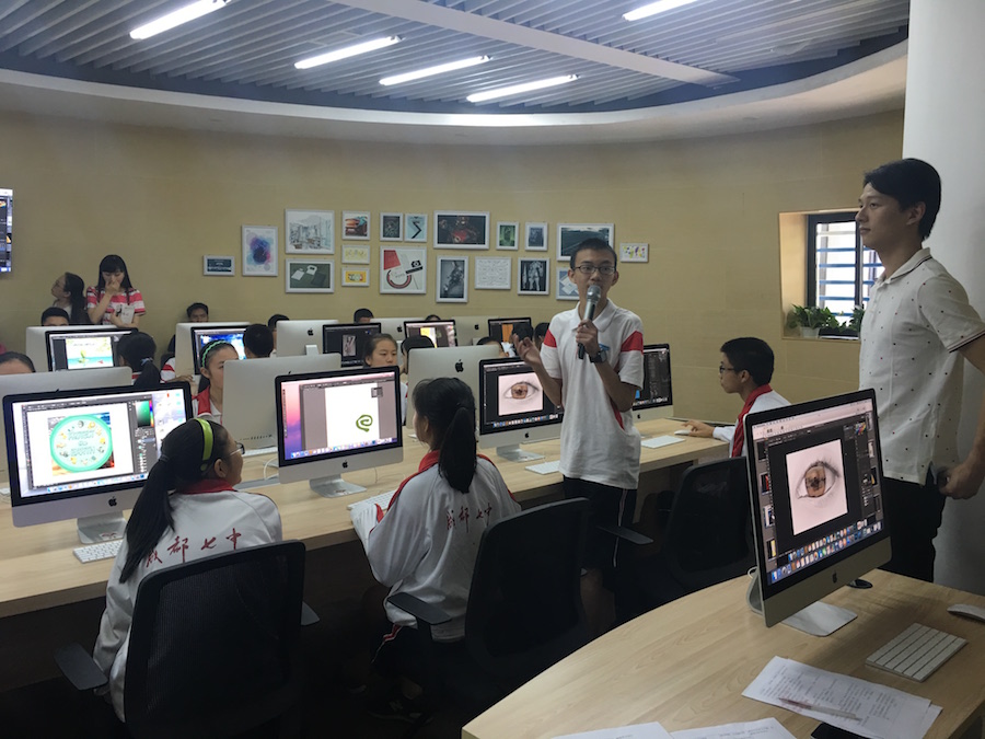 研讨会展示了物理组周钢老师执教的《两种电荷》,课堂上的学习探究逐步深入,微视频、现场拍摄以及 iTeach检测平台的使用,多种学习方式综合运用,让学生的认识更加深刻,学习过程更加真实。政治组肖丽萍与陈玉芳执教的财商课程《投资与理财》,两位老师指导学生通过竞赛端虚拟交易平台,模拟真实股市的同步交易,进行“七初华尔街争霸赛”股票实操练习。整堂课学生激动兴奋,观课的老师们也是兴趣盎然。美术组万里航老师执教的多媒体创意设计课程《公益海报设计》,让学生走进光与影的世界,徜徉于想像与现实之中,学生如痴如醉地用鼠标涂抺着自己的作品。信息组夏小刚老师执教的创客课程《3D打印挂件制作》,课堂上以社徽模型的制作讲解并指导各小组完成本小组的挂件模型、切片并打印,同学们将打印好的社徽、校徽赠送给在场的嘉宾、老师。物理组帅建明执教的创客课程《父亲节的礼物》,老师指导学生利用“微型机床”现场进行创作——献给父亲节的礼物,学生娴熟的技术、精妙的创作得到来访老师们的称赞。
