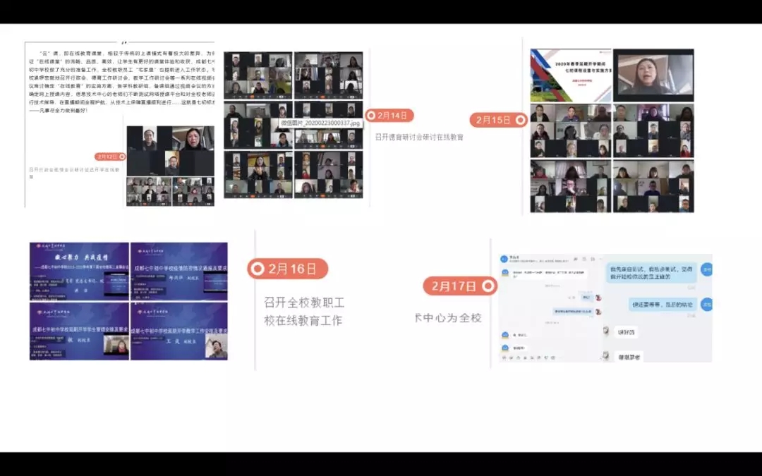 2月16日,通过各班级群发布《聚力战疫情,携手助成长——成都七中初中学校新冠肺炎疫情期间居家学习实施建议告家长书》,建议七初的家长们借助这次疫情的生活教科书,重视对孩子的生命教育、自主管理教育、职业生涯教育、责任与担当教育、感恩教育、独立思考的教育等。