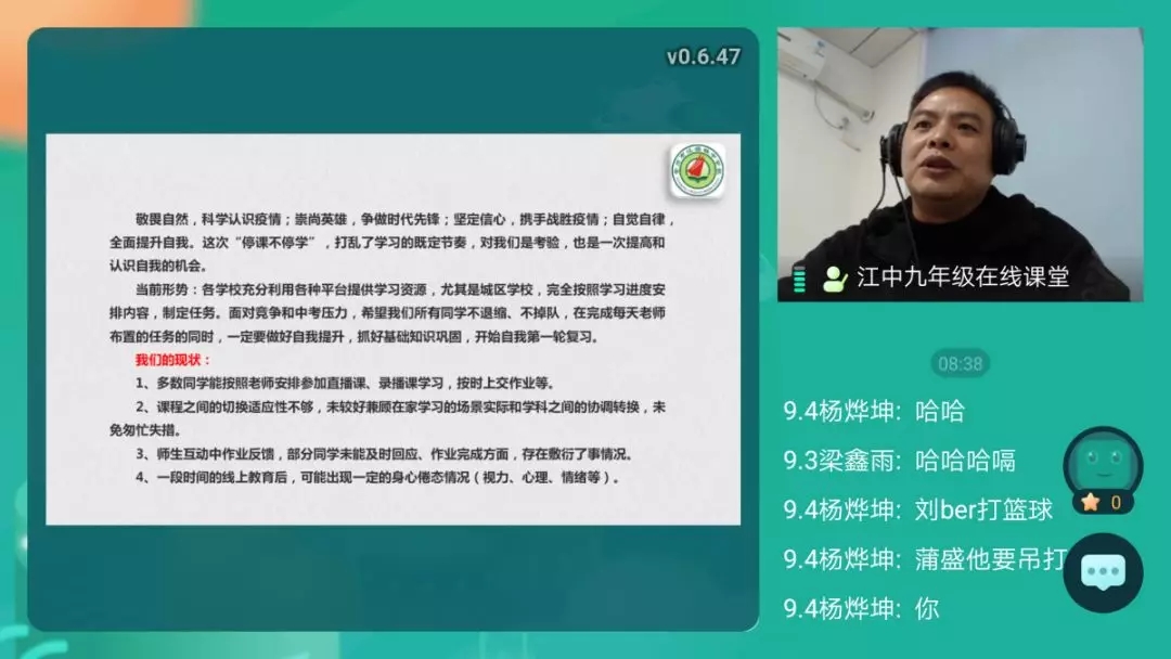 丰富在线课程体系,提升居家学习品质,“停课不停教,停课不停学”。针对在线学习、居家学习和自主学习的特点、规律,设置丰富多彩、适合学生发展的在线课程和教学活动,如校长课堂,战疫“心”行动——心理微课,战疫情诗词赏析,战疫情歌曲创作,战疫情中的美术作品创作,战疫情英语趣配音,地理眼看疫情,从生物学的角度看传染病的防控,在线指导发音训练,学生居家拓展学习,教师综合素质大赛等。