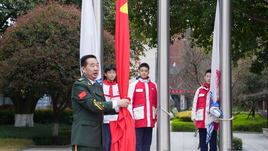 董立敢上校赠予学校一面独特的大号国旗。希望同学们以国旗指引方向,在推进中国式现代化中贡献青春力量。