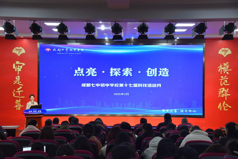 为深入贯彻党的二十大“实施科教兴国战略,强化现代化建设人才支撑”重大部署,成都七中初中学校高度重视,精心组织,于2025年3月17日正式启动第十七届科技活动月。本届科技活动月以“点亮·探索·创造”为主题,从科学精神传承、前沿科技实践、创新人才培育三大维度出发,旨在进一步弘扬科学家精神,通过展现新时代青少年勇攀科技高峰的担当,为建设科技强国汇聚智慧和力量。