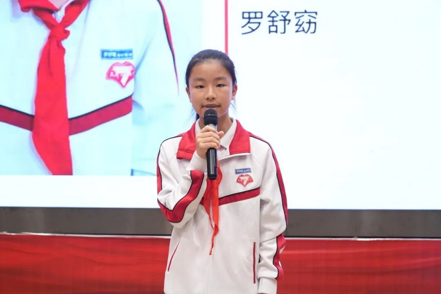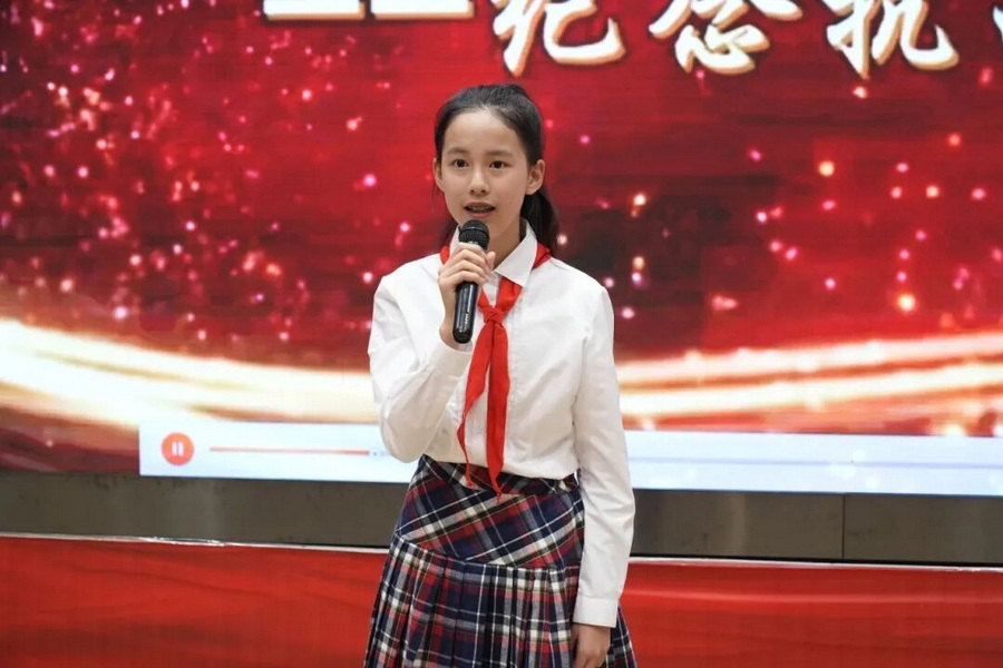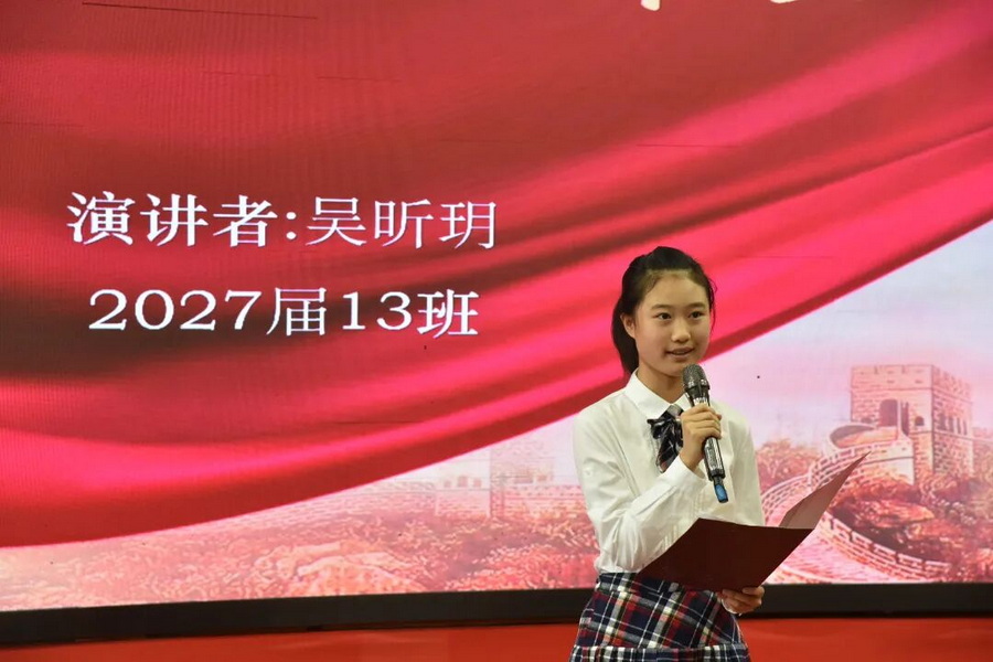 2027届9班的王辰曦同学讲述了英雄的伟大事迹和现代科技的欣欣向荣,并号召同学们勿忘国耻,强国有我!