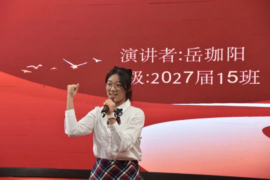 2027届11班贺子馨同学声音洪亮,情感饱满,她从“九一八”警报切入,号召同学们“把今天的心跳变成明天的行动”,将爱国之情化为报国之行,用青春守护来之不易的和平荣光。
