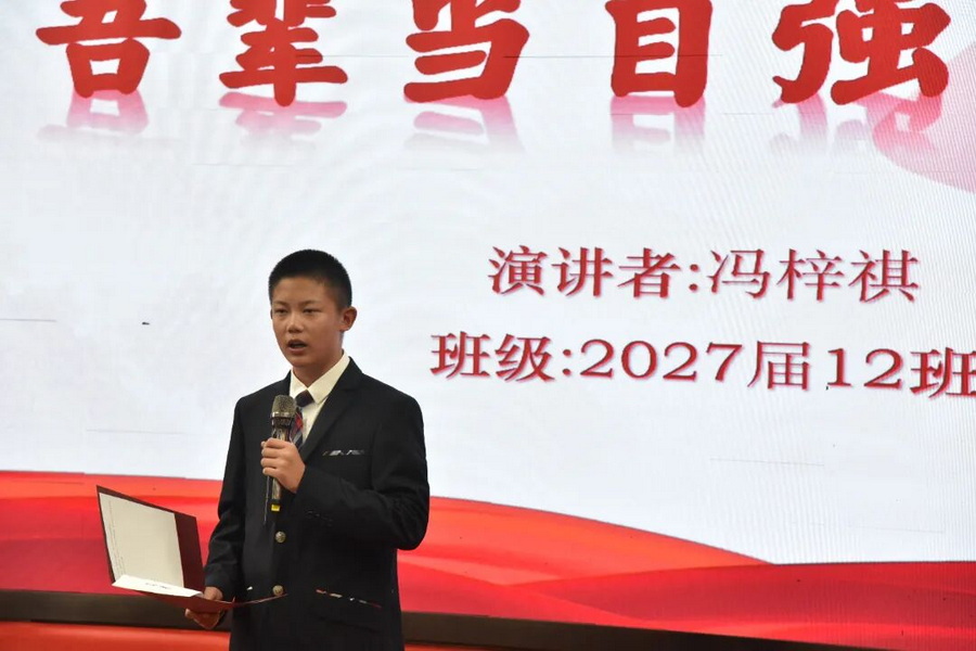 2027届12班冯梓祺同学强调“勿忘峥嵘史,吾辈当自强”,号召同学们要将个人理想融入国家发展伟业。