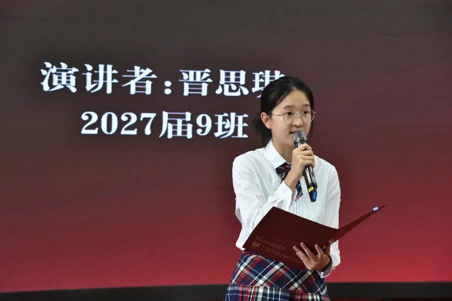 2027届4班翁雨晴同学声情并茂的演讲引发大家共鸣,呼吁当代少年成为黑暗中的炬火,用青春之笔书写“山河无恙,吾辈自强”的时代答卷。