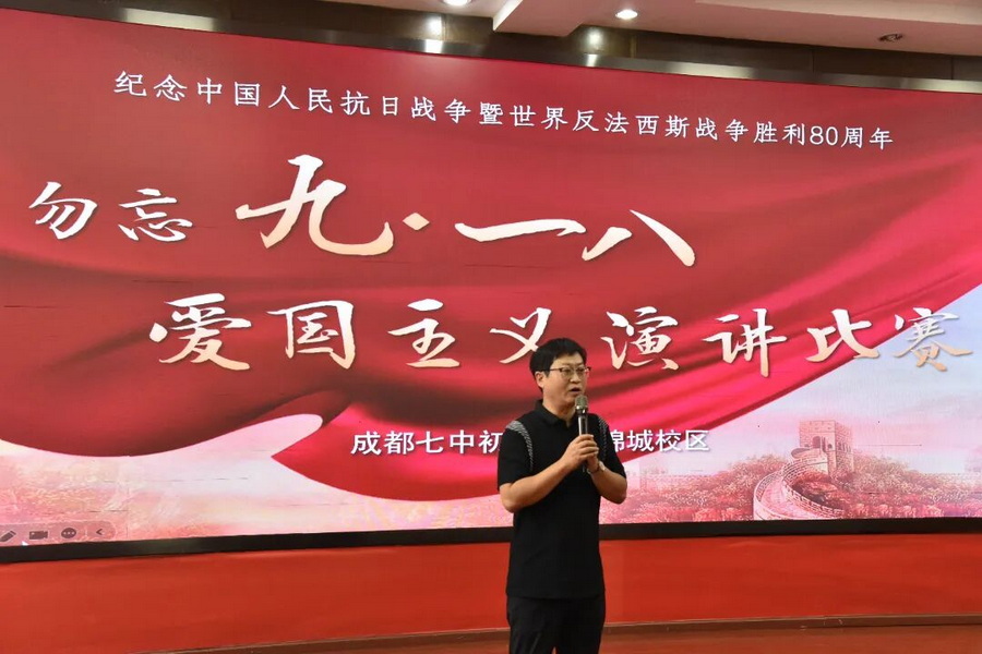 9月16日,成都七中初中学校纪念“九一八”爱国主义演讲比赛在天环校区学术一厅顺利举行。选手们赛前进行了充分准备,由成都七中初中学校副校长朱文英、副校长何鑫、2027届年级组长姜文思、历史组教研组长廖莹莹、历史组向秀红老师等组成专业评审团,就主题立意、语言表达等多方面进行了综合考量与点评。