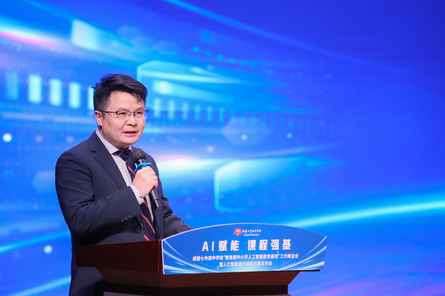 为贯彻落实教育部办公厅《关于加强中小学人工智能教育的通知》精神,扎实推进教育部中小学人工智能教育基地建设。2025年3月11日,成都七中初中学校成功举办了“教育部中小学人工智能教育基地”工作推进会暨人工智能通识课程方案发布会。本次活动以“AI赋能 课程强基”为主题,汇聚了政府、学校、家庭、社会和企业等多方力量,共同绘制了人工智能教育的新蓝图。
